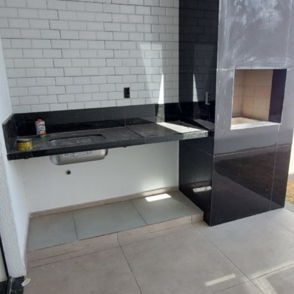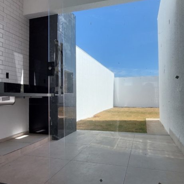 Casa de 3 quartos, sendo uma suíte, cozinha americana, banheiro social, área de serviço, espaço gourmet com churrasqueira, jardim de inverno, duas vagas de garagem e quintal gramado.