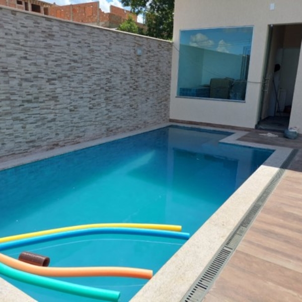 - Casa de 2 quartos, sendo uma suíte, cozinha integrada com a sala, banheiro social e banheiro lazer, área de serviço, ducha, deck com churrasqueira, lavanderia, sauna e piscina. Acabamento de alto padrão.